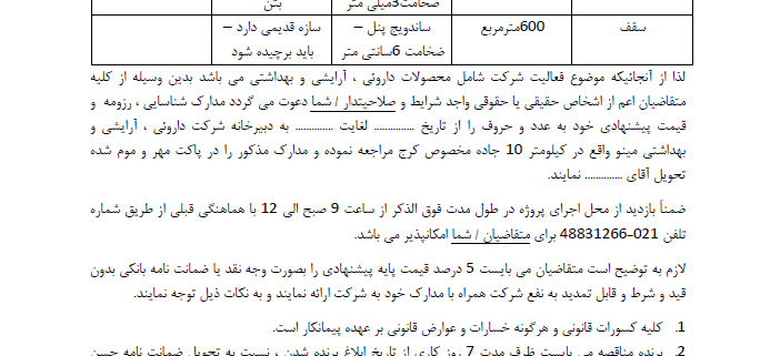 ضمناً بازدید از محل اجرای پروژه در طول مدت فوق الذکر از ساعت 9 صبح الی 12 با هماهنگی قبلی از طریق شماره تلفن 021-48831266 و48831111 برای متقاضیان امکانپذیر می باشد.