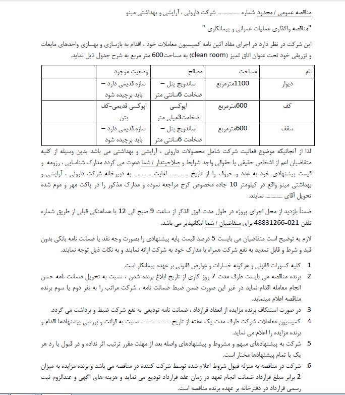 این شرکت در نظر دارد در اجرای مفاد آئین نامه کمیسیون معاملات خود ، اقدام به بازسازی و بهسازی واحدهای مایعات و تزریقی خود تحت عنوان اتاق تمیز (clean room) به مساحت600 متر مربع به شرح جدول ذیل نماید.